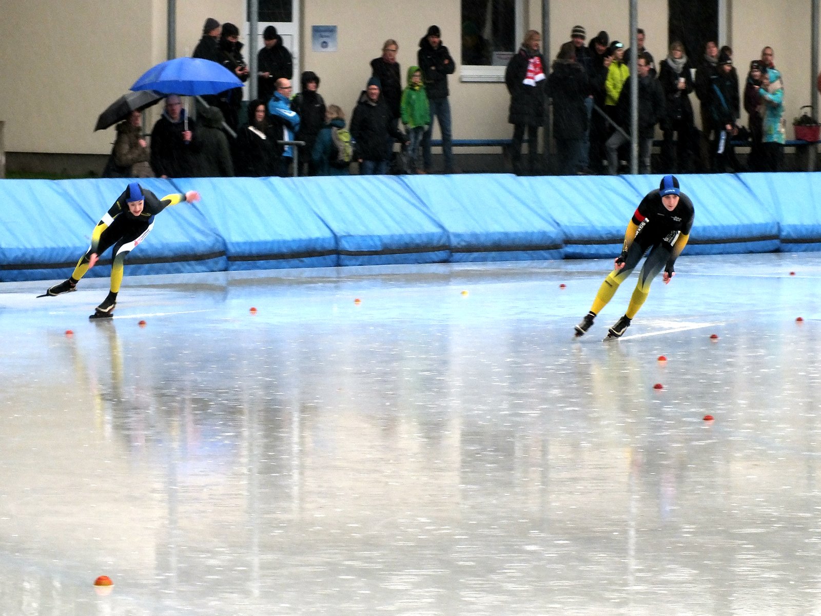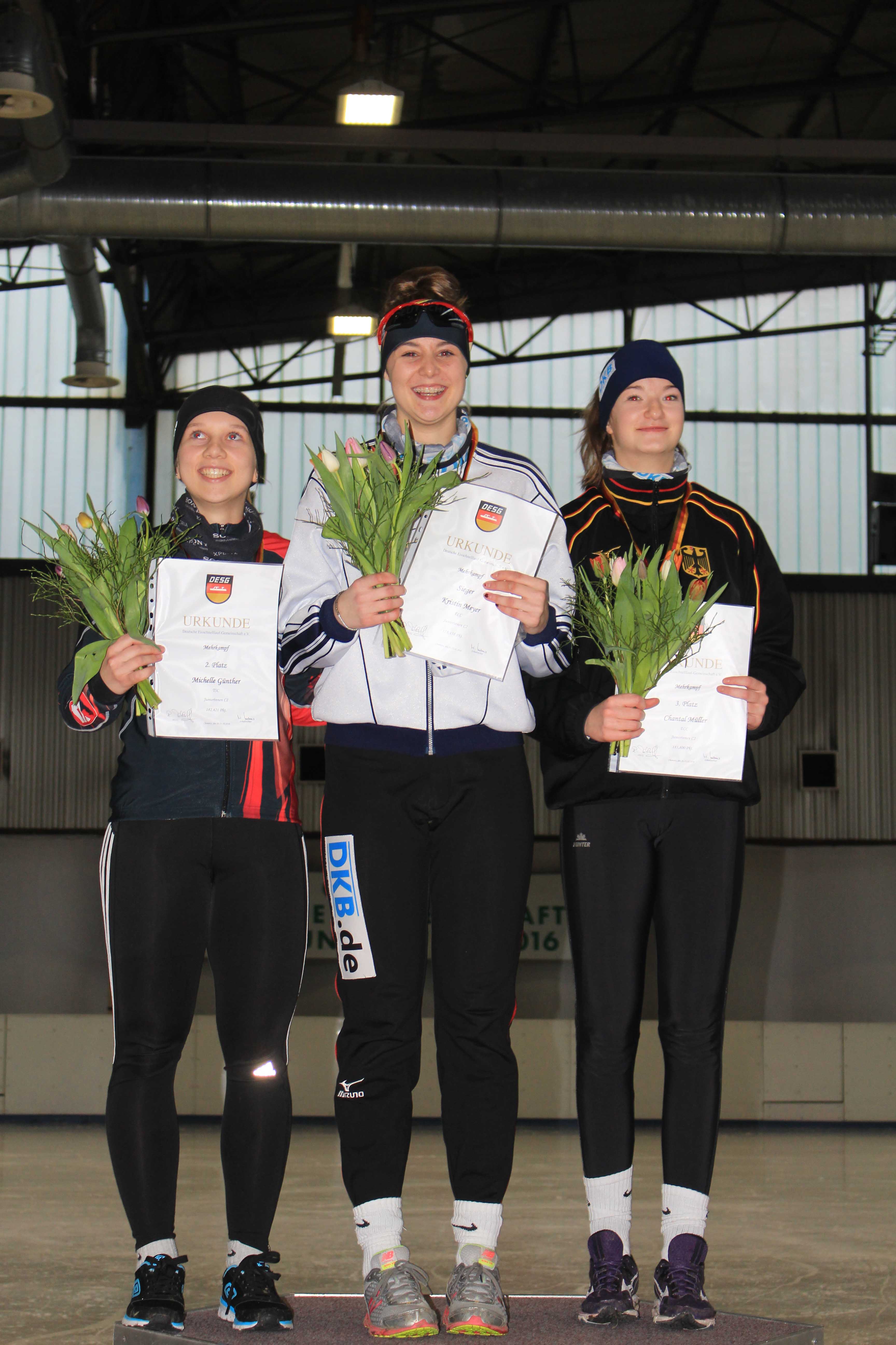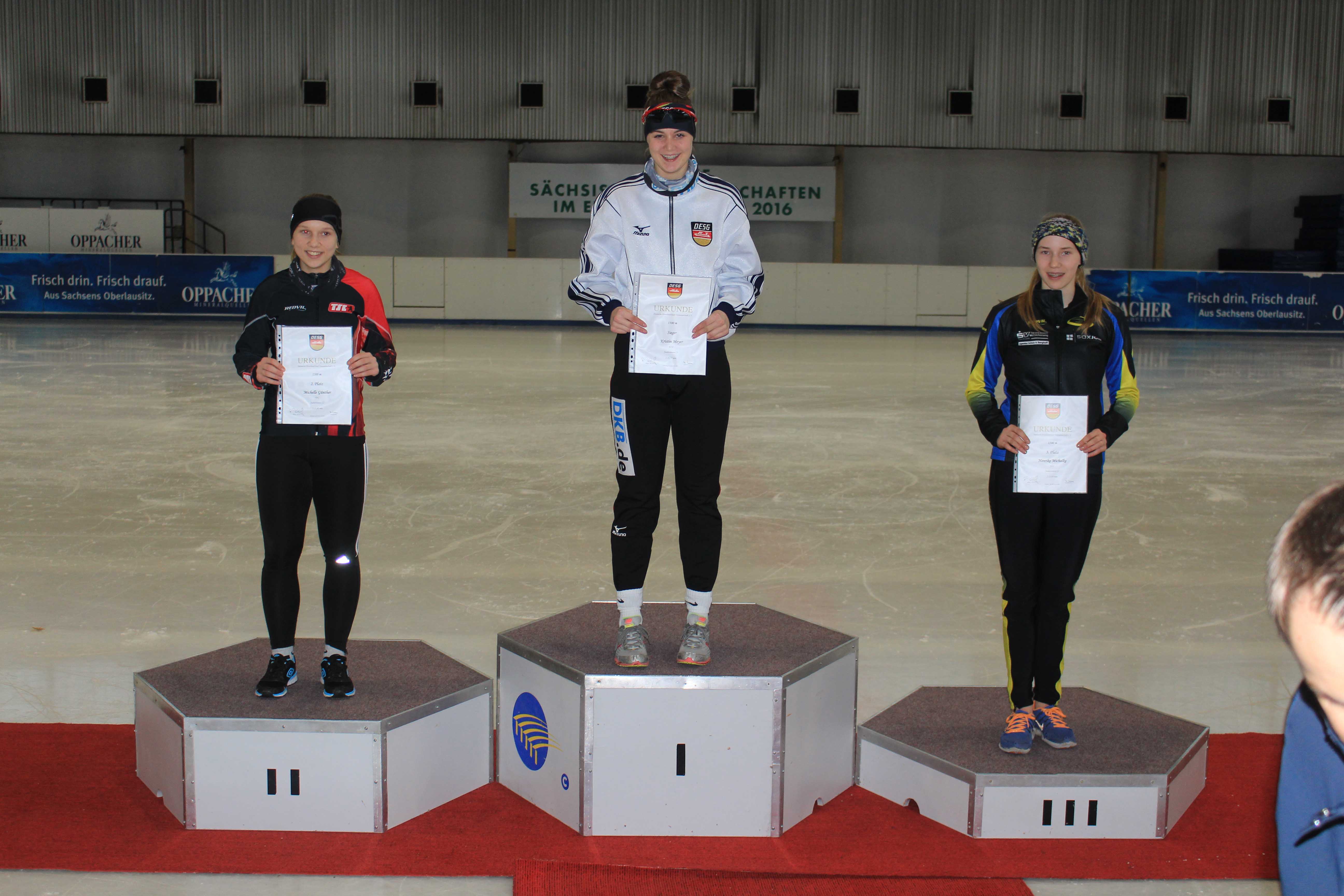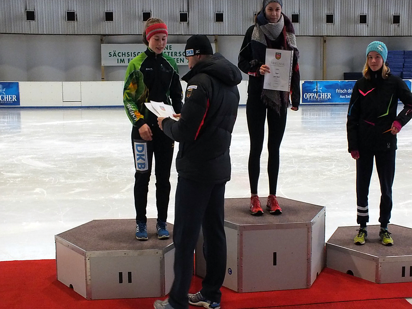 Am 20. und 21. Februar fanden auf dem Chemnitzer Eisoval als Saisonhöhepunkt die Deutschen Juniorenmeisterschaften 2016 in den Altersklassen C und D statt. Leider ließ sich das Wetter von den Sachsenmeisterschaften nicht konservieren, und so fanden die Wettkämpfe doch unter recht schlechten Bedingungen statt. Am Samstagvormittag war es noch trocken, doch gegen Mittag setzte der vorhergesagte Regen ein. Noch schlimmer war es am Sonntag. Teilweise standen Seen auf dem Eis, mancher büßte den Schliff seiner Kufen ein, es gab mehrere Stürze und meist war kämpfen statt gleiten angesagt. Umso bemerkenswerter, dass es einige Bahnrekorde gab durch Felix Motschmann (AK 12) aus München über 500 und 1500m sowie Denis Lederer (AK14) aus Berlin über 1000 und 3000m. Einmal mehr war aber festzustellen, dass unsere Bahn eine Überdachung braucht, um den Bundesstützpunkt konkurrenzfähig zu halten. Insgesamt waren 66 junge Damen und 55 Jungen am Start. Von den 10 Startern des ECC gibt es recht Erfreuliches zu berichten: Deutsche Mehrkampfmeisterin der Altersklasse C2 (15) wurde souverän Kristin Meyer. Sie konnte auch alle 4 Einzelstreckenwertungen für sich entscheiden. In der gleichen Altersklasse wurde das Podest durch Chantal Müller als Bronzemedaillengewinnerin komplettiert, die über 500m Zweite und über 1000m Dritte wurde.
