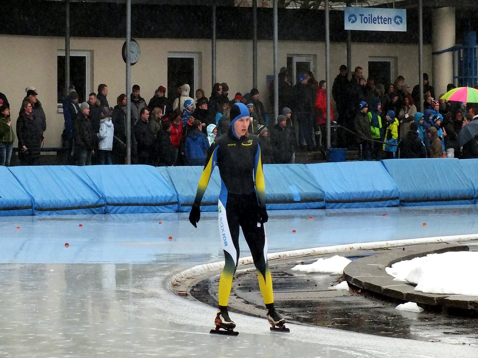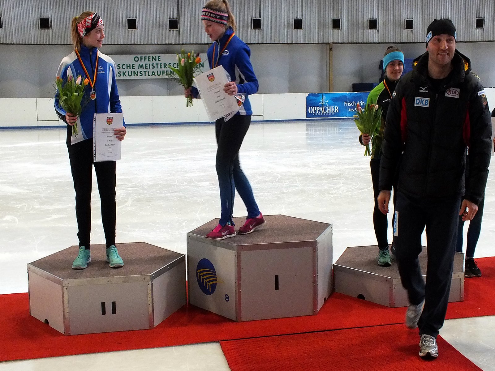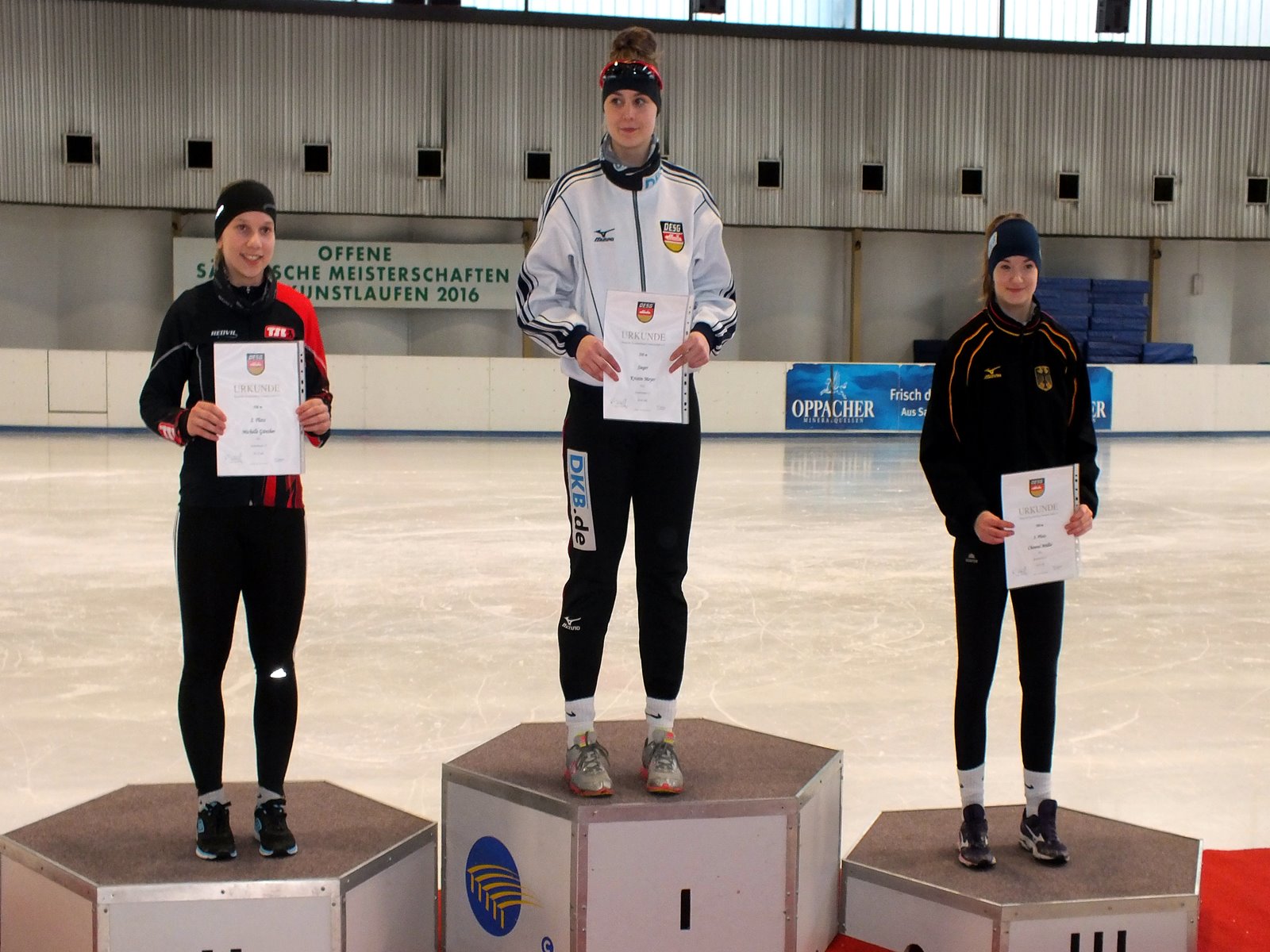 Am 20. und 21. Februar fanden auf dem Chemnitzer Eisoval als Saisonhöhepunkt die Deutschen Juniorenmeisterschaften 2016 in den Altersklassen C und D statt. Leider ließ sich das Wetter von den Sachsenmeisterschaften nicht konservieren, und so fanden die Wettkämpfe doch unter recht schlechten Bedingungen statt. Am Samstagvormittag war es noch trocken, doch gegen Mittag setzte der vorhergesagte Regen ein. Noch schlimmer war es am Sonntag. Teilweise standen Seen auf dem Eis, mancher büßte den Schliff seiner Kufen ein, es gab mehrere Stürze und meist war kämpfen statt gleiten angesagt. Umso bemerkenswerter, dass es einige Bahnrekorde gab durch Felix Motschmann (AK 12) aus München über 500 und 1500m sowie Denis Lederer (AK14) aus Berlin über 1000 und 3000m. Einmal mehr war aber festzustellen, dass unsere Bahn eine Überdachung braucht, um den Bundesstützpunkt konkurrenzfähig zu halten. Insgesamt waren 66 junge Damen und 55 Jungen am Start. Von den 10 Startern des ECC gibt es recht Erfreuliches zu berichten: Deutsche Mehrkampfmeisterin der Altersklasse C2 (15) wurde souverän Kristin Meyer. Sie konnte auch alle 4 Einzelstreckenwertungen für sich entscheiden. In der gleichen Altersklasse wurde das Podest durch Chantal Müller als Bronzemedaillengewinnerin komplettiert, die über 500m Zweite und über 1000m Dritte wurde.