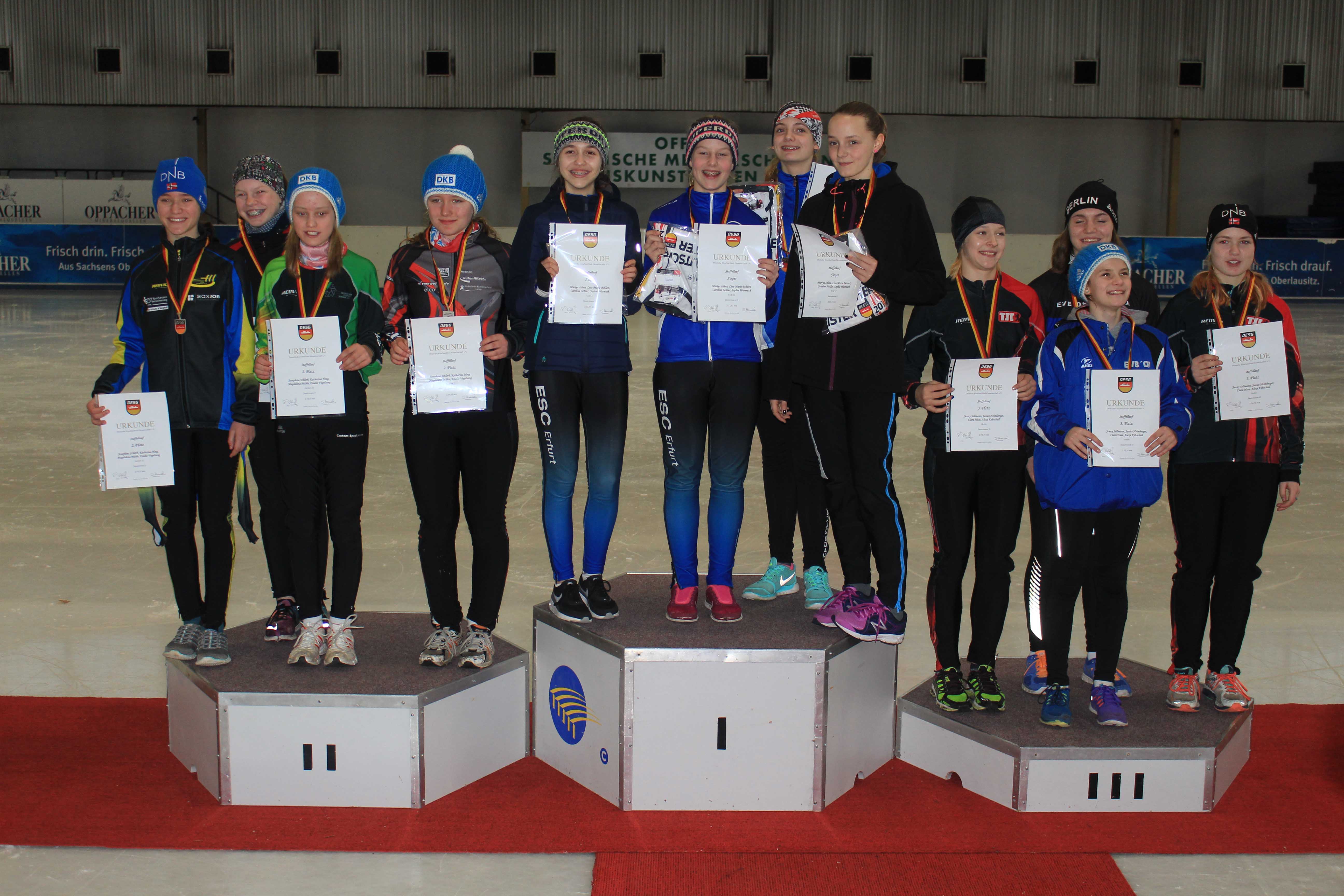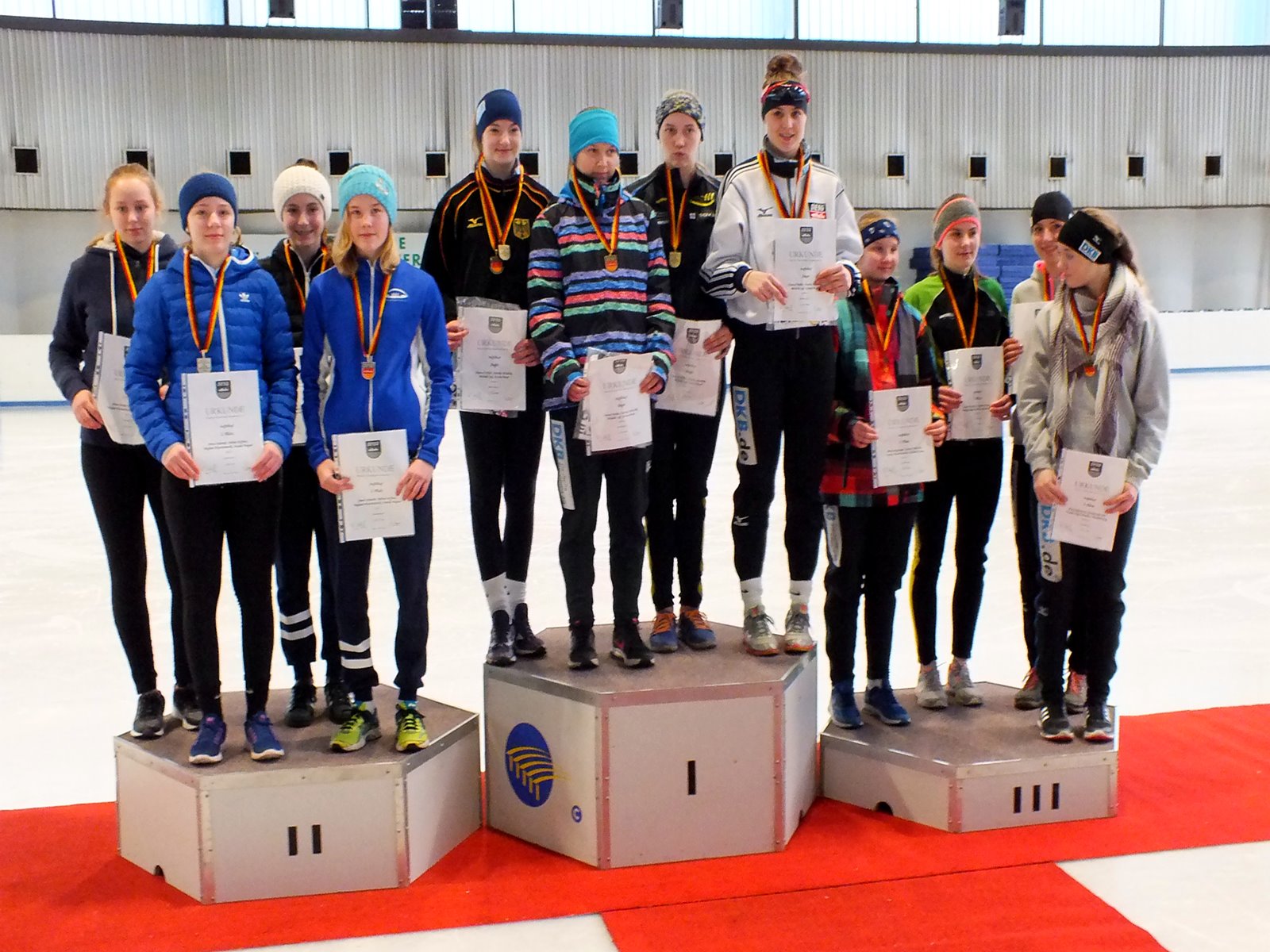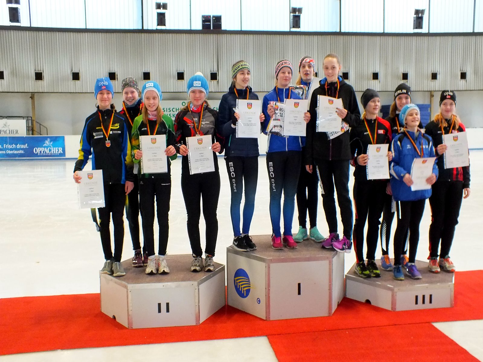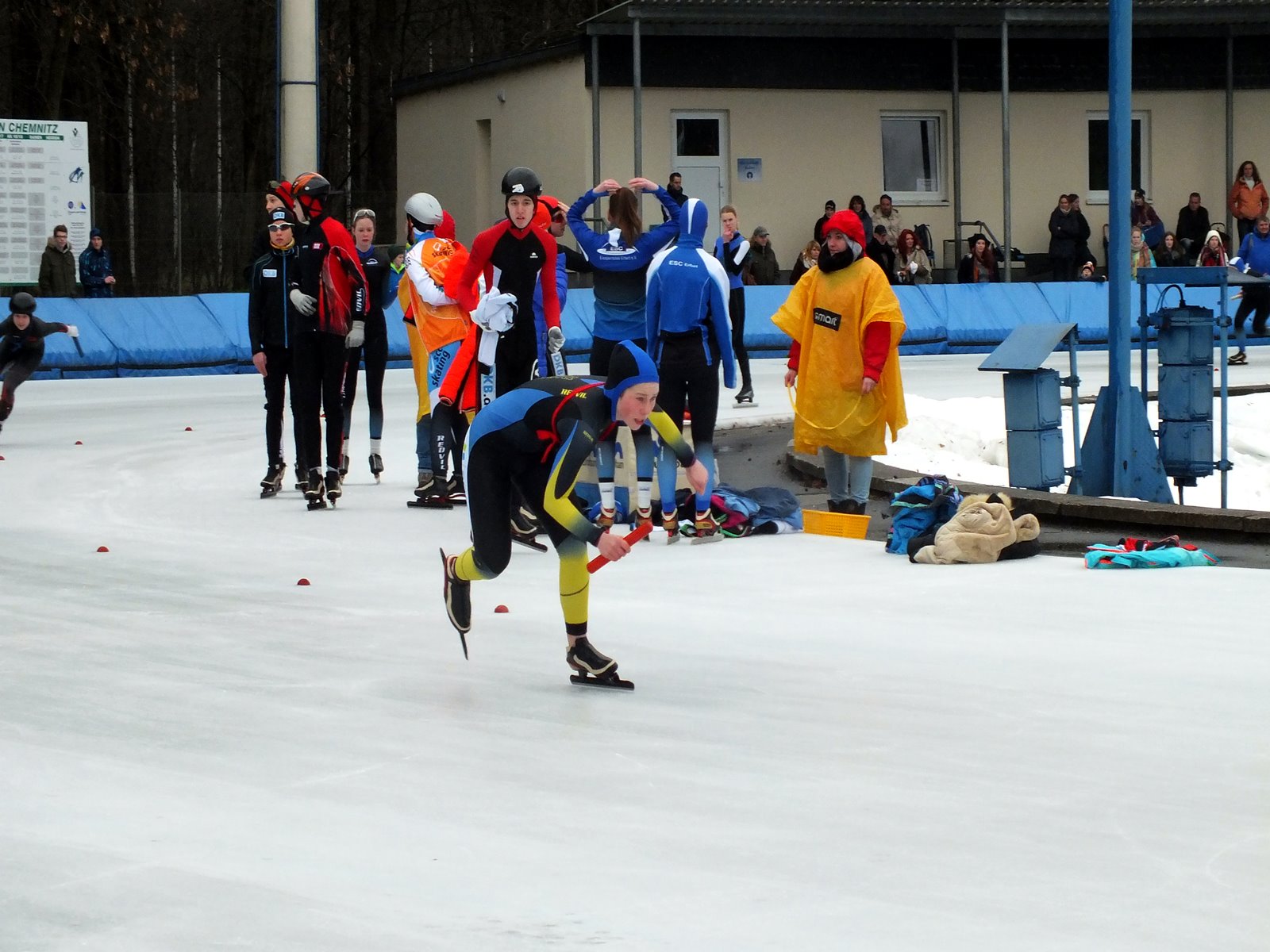 Henrike Michalke belegte den vierten Rang im Mehrkampf, wobei sie Zweite über 1000m und Dritte über 1500m wurde. Ähnlich erging es Katharina Pönisch als Vierte in der AK C1 (14), die zwar über 1000m siegte und Zweite über 1500m wurde, aber zu viel auf der Sprintstrecke einbüßte. Gianina Künstler und Lucy Mehnert belegten in der gleichen AK die Plätze 7 und 8. Gesundheitlich angeschlagen reichte es auch für Marius Platzer (C1) nur für den siebten Rang. In der Altersklasse D mussten die 12-jährigen (D1), die sich qualifiziert hatten, gemeinsam mit den Älteren aus der AK D2 (13) starten. Hier waren die Chemnitzer Farben nur durch Emelie Vogelsang (D1) und Babett Unger (D2) vom CPV, die in Chemnitz trainiert, vertreten. Babett gewann im Mehrkampf Bronze, Emelie wurde Siebente von 30 Startern und konnte über 1000m sogar Platz 3 belegen. Damit gewann sie auch das interne Duell der 12-jährigen.