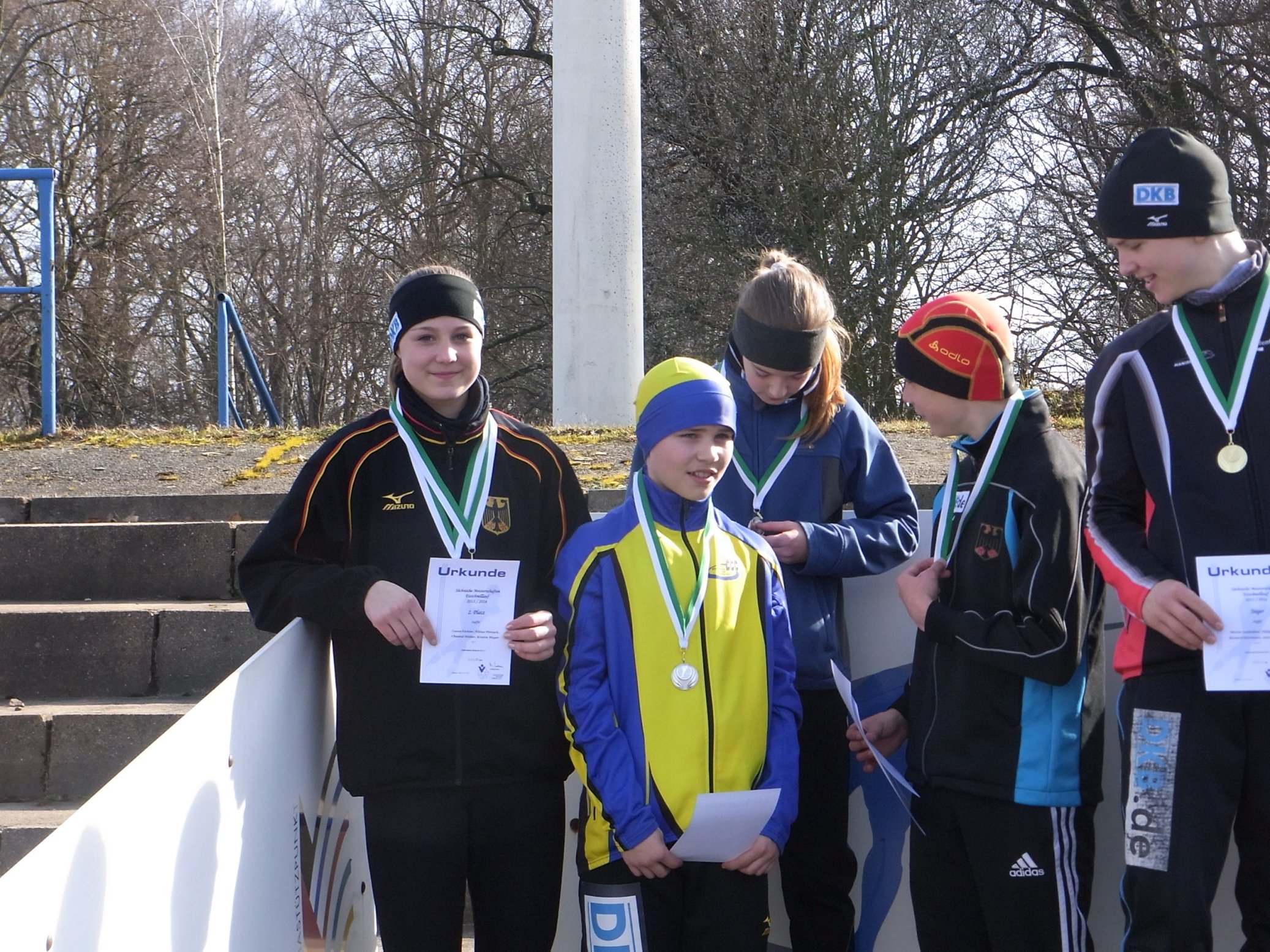In den Staffelläufen wurde es eng auf dem Eisoval, da sechs bzw. sieben Staffeln gleichzeitig unterwegs waren. Das große Wechselchaos blieb allerdings aus und alles lief, fast, reibungslos. In der AK E2/D1 kämpfte die erste Chemnitzer Staffel nach einem Sturz nicht nur um den Anschluss, sondern am Ende noch um eine Medaille. Nur ganz knapp hinter Dresden teilten sich beide Chemnitzer Staffeln den vierten Platz. Erfolgreicher war die erste Staffel der AK D2/C1 mit Kristin, Chantal, Lucas und Niklas, die zwischen den beiden Dresdner Teams die Silbermedaille gewann. Das zweite Chemnitzer Team wurde Fünfter.